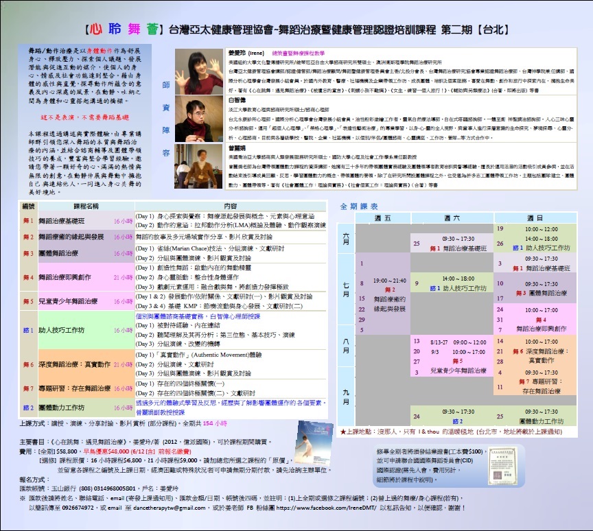 培訓課表、上課日期 (2016/06/19-09/25,分數次週五晚上及週末進行,共九門課,總時數154小時) 時間、師資、費用及報名方式等資訊請見圖檔。洽詢電話0926674972,email: dancetherapytw@gmail.com, 或以FB私訊詢問。謝謝您!